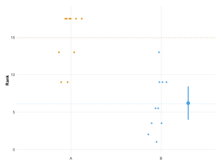 ## Unpaired mean rank difference of A (14.9, n=10) minus B (6.1, n=10)