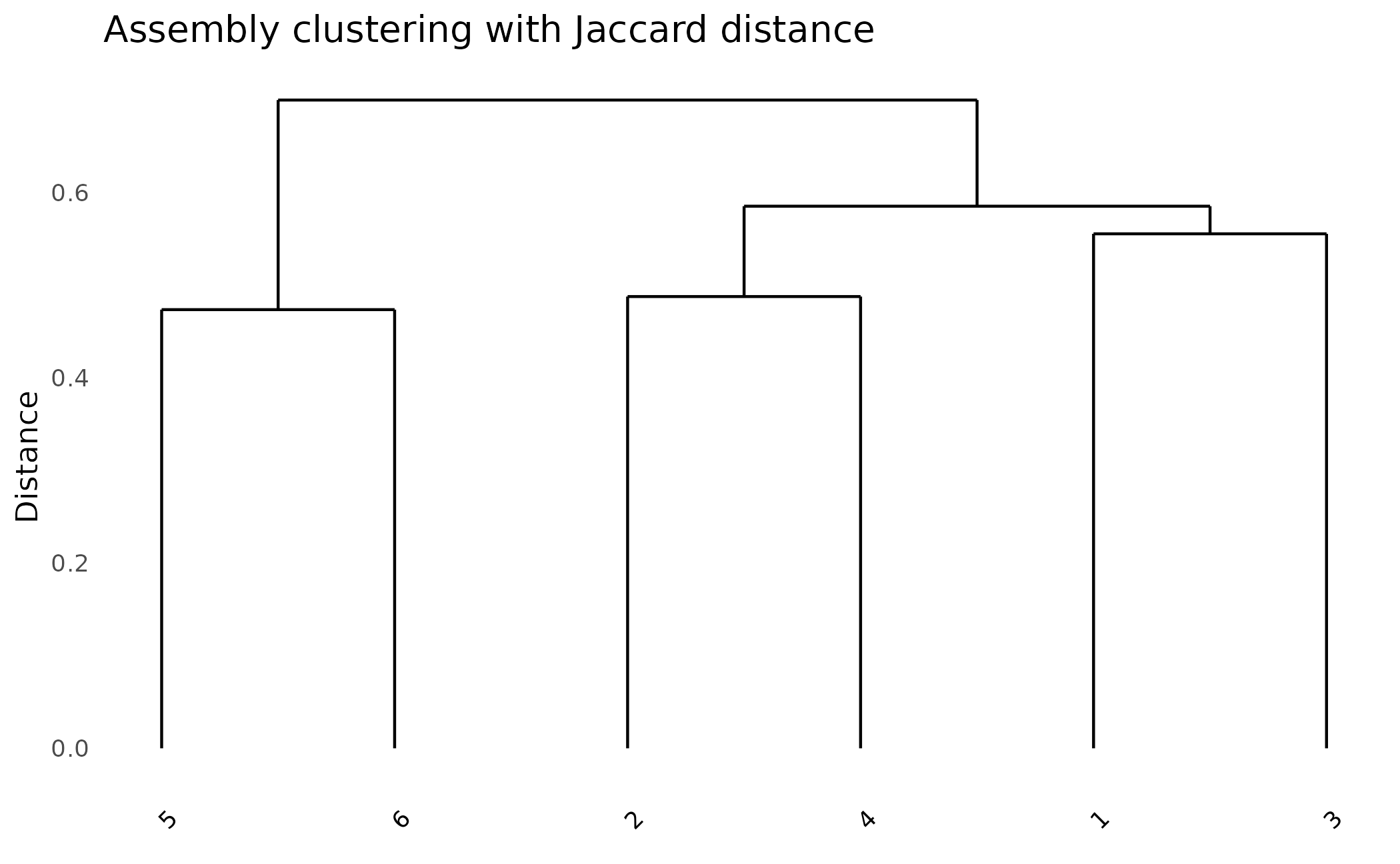 Once orthogroups are assigned, we can build a presence/absence matrix (rows = orthogroups, columns = assemblies). To compare how similar two assemblies are based on their shared orthogroup content, we need a distance metric. This is used for hierarchical clustering and visualizations like dendrograms.