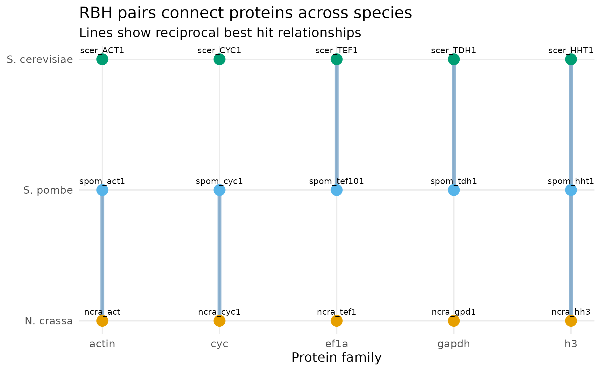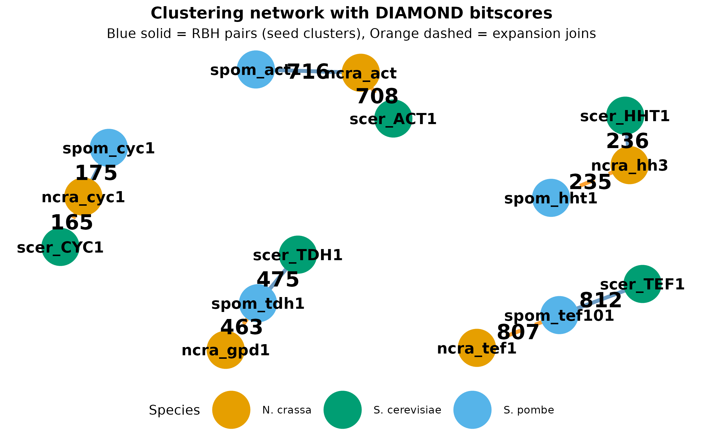 This vignette walks through the DIAMOND RBH + Expansion clustering algorithm step by step, using real data from known fungal orthologs. Instead of describing algorithms conceptually, we show exactly what happens at each stage with actual sequence data.
