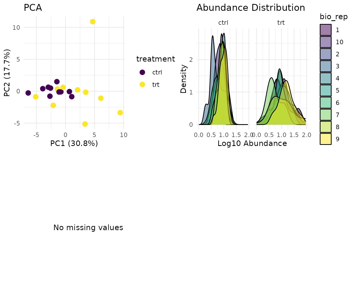 #> - Peptides with missing values: 0 (0.0%)Quick look at your data