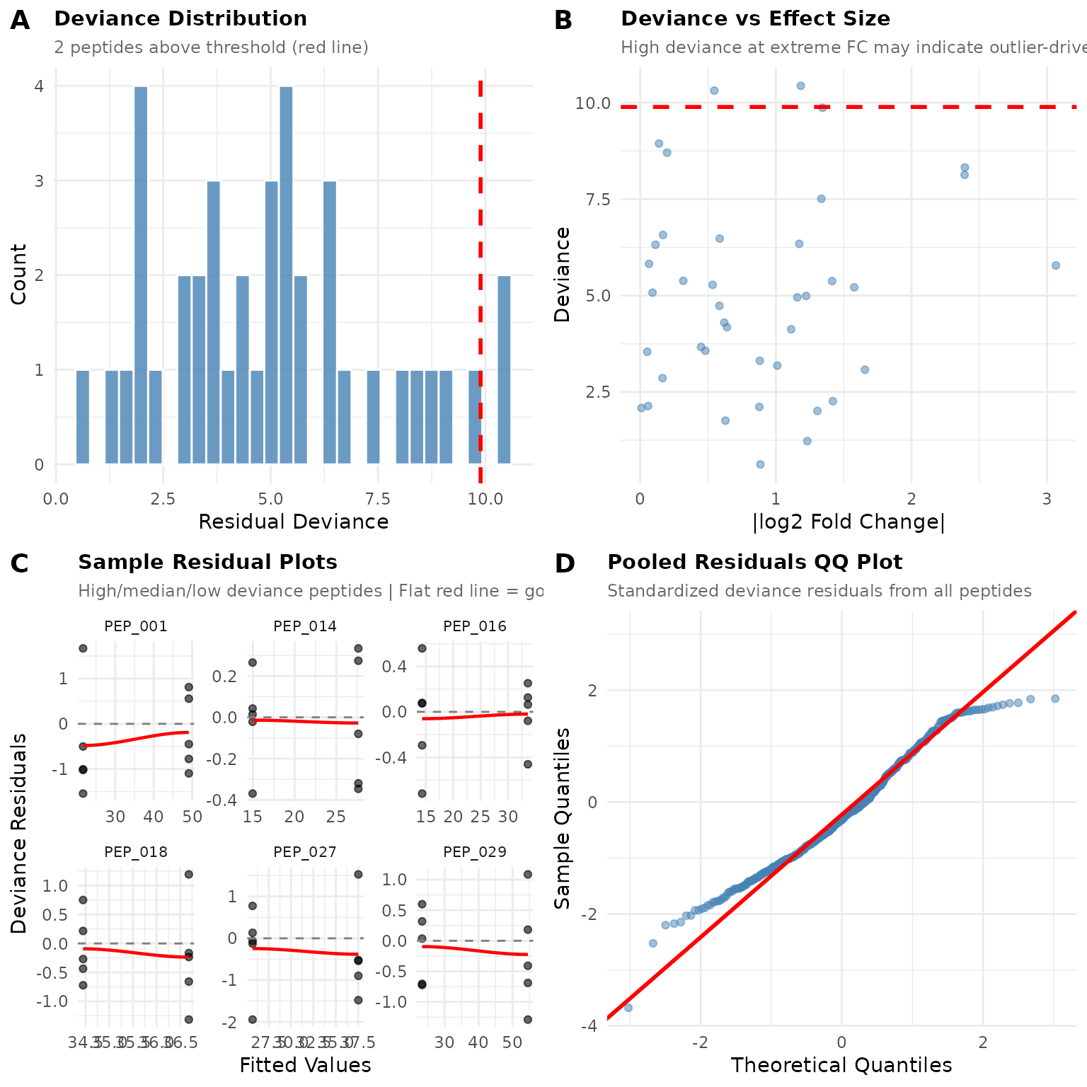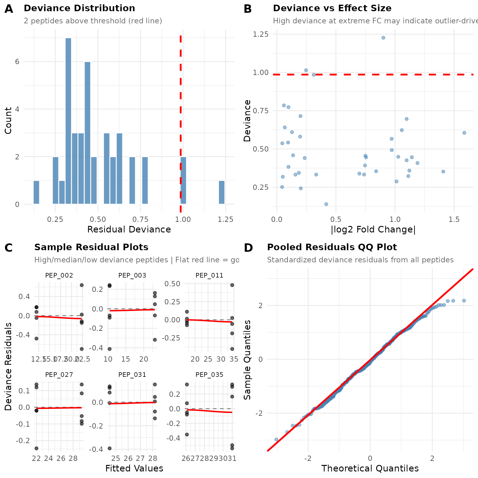 #> Interpretation: Some peptides show elevated deviance. Check residual plots.