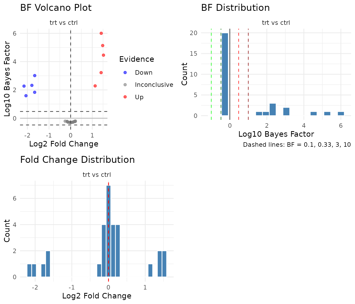 #> Significant (BF > 3): 10 (33.3%)Notice the output is different from the other tests. Instead of “Significant (FDR < 0.05)”, you see an evidence breakdown and “Significant (BF > 3)”. This reflects a fundamental difference in how Bayes factors work.