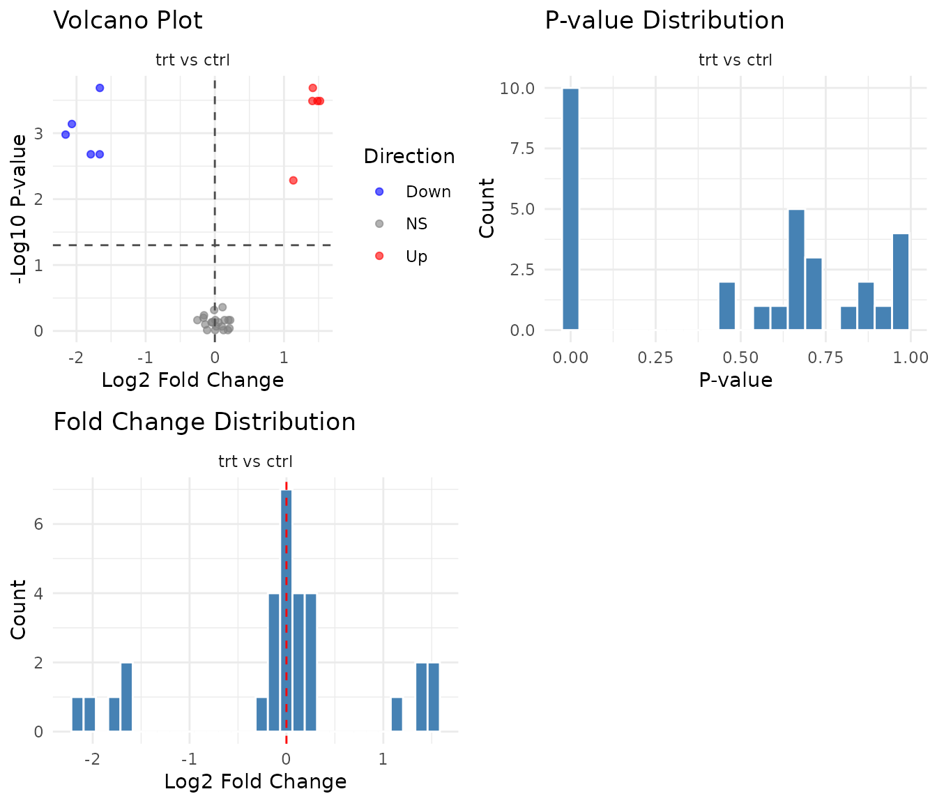 For p-value based tests, the multi-panel plot shows a volcano plot, p-value histogram, and fold change distribution: